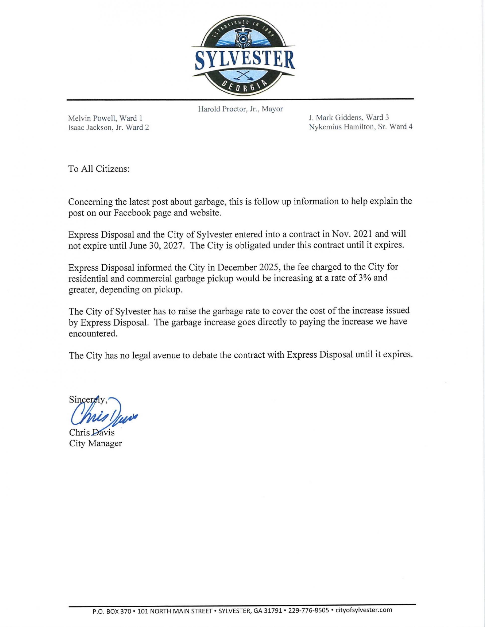 Attention City of Sylvester Sanitation Customers